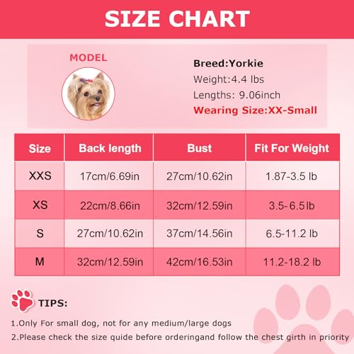【Suitable Ranges 】❄️ Small dog clothes have 4 sizes to choose: XXS-M. Girl dog clothes for 1 lbs to 16.5 lbs of the pet Eg, Chihuahua clothes, Teacup dog clothes, Yorkie clothes, Pomeranian, Pugs, Maltese, Shih Tzu puppy clothes, Mini dachshund, Boston terrier puppy, Toy poodle, French bulldog puppy, Miniature poodle, min pin and so on, also recommended to cats/ kitten outfits.