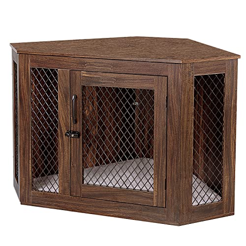 [Diverse and Useful Functions]: It is a delicate and elegant furniture decoration.The wide top provides additional placement space to add home décor such as plants, magazines, family photo frames and night lights.Corner wooden dog kennels can be used as end tables, side tables, corner tables and corner TV stand.The bottom of the oxford cloth anti-slip treatment of the comfortable shu velvet cushion to bring soft enjoyment, providing a comfortable sleep for dogs