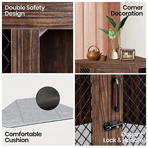 [Perfect Corner Design]: The new furniture-style corner dog crate uses a unique corner design to make full use of the limited space, turning the incompletely used corner into a warm and comfortable private space for dogs. Keep the room neat and orderly while meeting the dog’s resting needs[Carefully Selected Quality Materials]: Our furniture corner dog crate is made of top grade P2 MDF board and Q195 high grade iron,which ensures the sturdiness and stability for long term use.Top P2 grade MDF board has passed EPA certification,safe,non-toxic and tasteless,can be assured that your pet use,reliable quality makes the service life of another grade.Q195 heavy-duty rust-proof treated iron is stable,reliable and durable,and the surface mesh design provides the necessary breathability