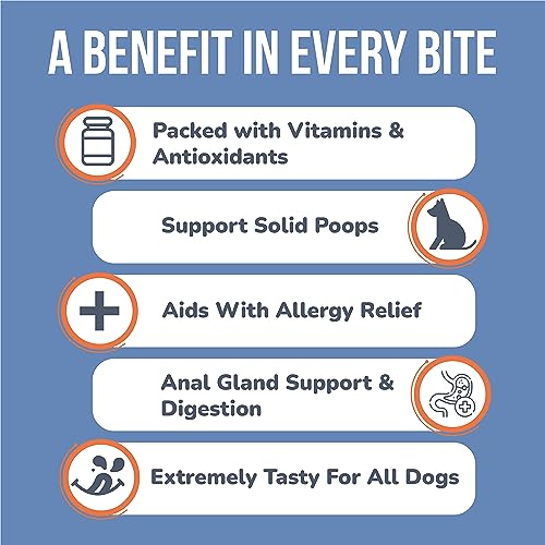 DIGESTION SUPPORT & STOP SCOOTING, Our dog anal gland chews are made to reduce diarrhea, to help give your dog the perfect poop. After 2 years of development, we took our original pumpkin dog treats and added effective probiotics for dogs digestive health. This anal gland supplement is enriched with pumpkin for dogs and fiber to ensure your dog receives comprehensive support for gut health and anal glands.