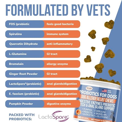 PROBIOTIC CHEWS FOR DOGS, Our soft chews are enriched with fiber and digestive enzymes with probiotics and prebiotics for dogs. Each soft chew also includes pumpkin powder for dogs, plus ginger, Spirulina, Quercetin with Bromelain for dogs. These unique dog probiotic chews provide essential nutrients without artificial additives, catering to your pet’s nutritional needs and dog allergy support by being grain free, wheat free, and gluten free.