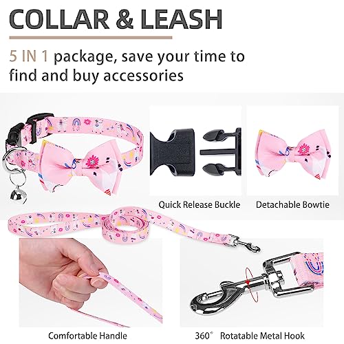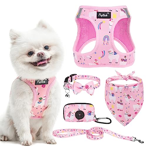 [DOG HARNESS, COLLAR & LEASH] – The package includes three items, a walking harness, a collar, and a 4.9ft matching leash. The collar is with bell, the leash is equipped with a 360-degree rotation metal hook, and the harness is adopted with a quick-release buckle and double D-rings which are very heavy-duty. You don’t need to spend extra time looking through other accessories, but you get all of these items at the same time with less money! So this is a very cost-effective set.[STEP IN, NO PULL, NO CHOKE] – The harness is adopted magic strap closure, so it’s very easy for wearing. Just open the harness, let your dog’s front legs through the harness, then reclose the closure and buckle it up, and connect the leash with double D-rings, finished! Cushioned design reduces neck friction, and the metal D-ring easily links to leash hooks, not easy to swing, preventing suffocation and pull.
