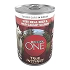 Give your devoted dog something delicious and nourishing to sink his teeth into with Purina ONE Natural True Instinct Tender Cuts in Gravy With Real Beef and Wild-Caught Salmon adult wet dog food with added vitamins, minerals and nutrients. Every serving features real beef and wild-caught salmon, plus natural ingredients for expertly crafted nourishment and taste. This wet food for dogs contains no poultry by-products and 0 percent fillers, which means every high-quality ingredient has a purpose. The tender, meaty cuts deliver a tempting texture to enrich his dining experience, while the savory dog food gravy offers the perfect finishing touch. Our high protein dog food helps to support his strong muscles so he can keep up with his daily adventures. Deliver nutrition to your dog’s bowl at mealtime when you make this Purina ONE canned dog food recipe with dog food gravy part of his regular feeding routine.