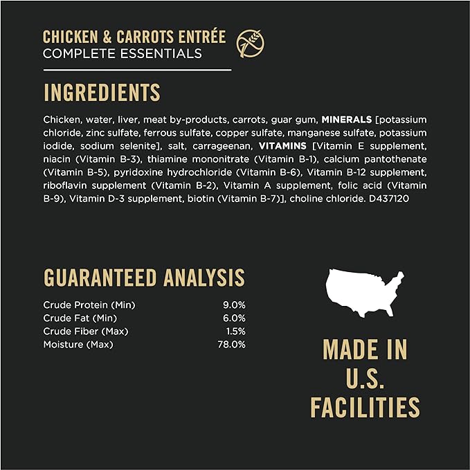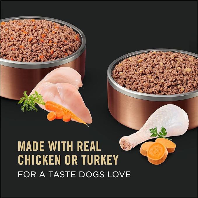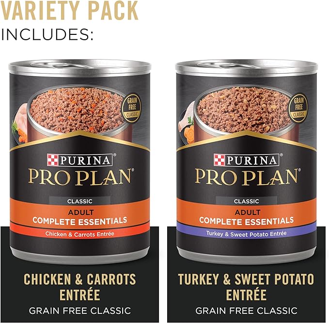 Expand your dog’s menu with this Purina Pro Plan COMPLETE ESSENTIALS Grain Free adult wet dog food variety pack. With real chicken or turkey as the first ingredient, both dog wet food formulas supply high protein to help maintain muscle mass. The tempting taste fills each moist, tender bite to make mealtime exciting. Each serving supplies 23 essential vitamins and minerals to help support his overall health and wellness. This premium dog food variety pack has no artificial colors, flavors or preservatives to give your adult dog 100 percent complete and balanced nutrition free of unwanted ingredients. Each pate dog food loaf formula helps support his healthy immune system and nourishes your dog’s healthy skin and coat. Try both Purina dog food flavors in the Purina Pro Plan COMPLETE ESSENTIALS grain free wet dog food collection to give him the nutrition he needs with a tempting taste he loves. We proudly manufacture our high protein grain free dog food at Purina-owned, U.S. facilities.