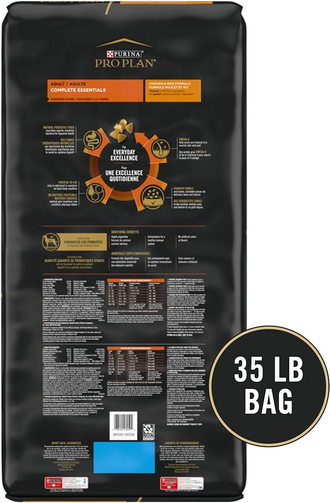 Make mealtime your dog’s favorite time of the day when you feed him Purina Pro Plan Brand Dog Food Shredded Blend Chicken and Rice Formula adult dog food. Real chicken as the first ingredient and rice, an excellent source of carbohydrates for energy, along with other high-quality ingredients create a dog food with great flavor. The hard dog food kibble and tender shredded pieces provide a texture sure to keep him engaged. Feel good about serving dog food with 100 percent complete and balanced nutrition, and rest easy knowing that each serving contains optimal levels of protein and fat that help dogs maintain an ideal body condition. Vitamin A and linoleic acid, an omega-6 fatty acid, promote healthy skin and coat to keep him looking great, and guaranteed live probiotics help to support his digestive health. Formulated with high-quality protein and other essential nutrients, this Purina Pro Plan COMPLETE ESSENTIALS dog food formula helps support your pet’s overall health and wellness.