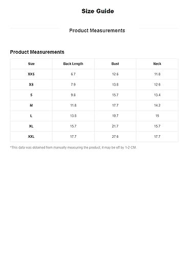 XX-Large: Back Length: 17.7,” Bust: 27.6,” Neck: 17.7,”