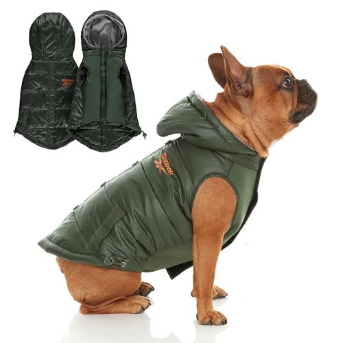 CUTE DESIGN FEATURES: This puffer jacket for dogs from Rebook has practical features! A hoodie, two side pockets, an adjustable drawstring, and a leash hole for taking walks with style.