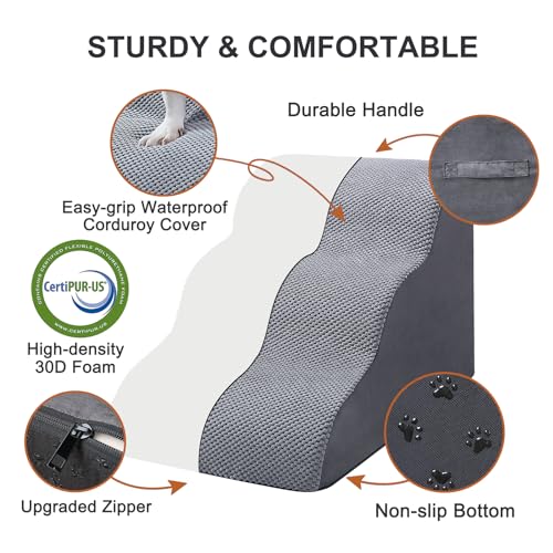 - SAFETY & STURDY DOG STAIRS: Dog ramps for small dogs are constructed from high-density 30D foam, which has good recovery and is not easy to deform and collapse, providing excellent support for dogs and cats, safeguarding their joints, and offering maximum climbing comfort. The dog steps feature a non-slip bottom and lightweight sponge material, ensuring a safe climbing experience for pups, older dogs, or injured cats, whether indoors or outdoors