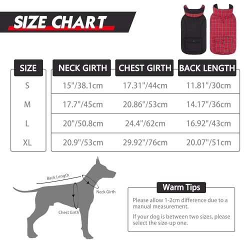WINDPRROF, WATER-RESISTANT & WARM DOG CLOTHES: All of our dog coats are designed with three layers which warmer than normal jackets. The first layer is durable polyester made; the middle layer is thick cotton that can lock warmth; the third layer is plaid cotton fabric which is soft and skin-friendly. The plain pattern side has a water-resistant effect in foggy or drizzly weather.