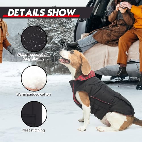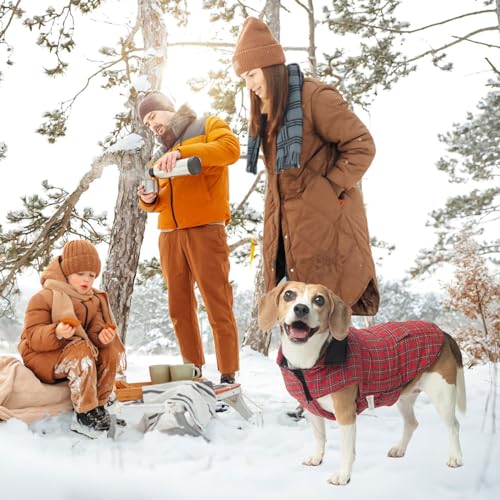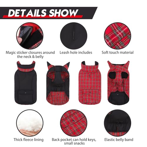 REVERSIBLE WITH POCKET: The dog winter coats can be double-sided worn according to your choice. The plain pattern is classic and never out of date, the plaid pattern is stylish british style. Each sides are equipped with pocket, not only has a decorative effect, but also practical, such as when you go out you can put some small snacks and so on.