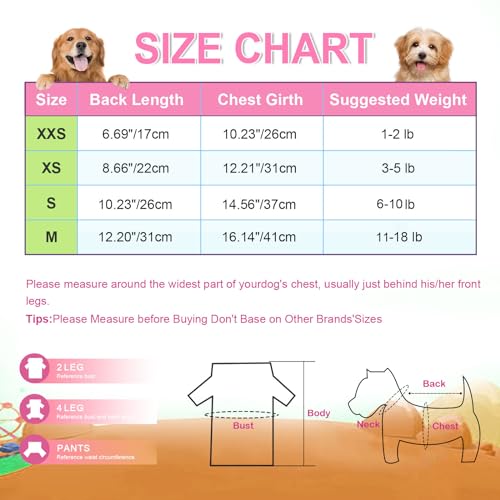 【Suitable for 1 to 15 Pound Dogs】: The dog pajamas sweater size XXS, XS,S,M fit for tiny dog, little dog, extra small dogs, miniature dog; There puppy pjs clothes not only fit for extra small dogs such as Havanese, Pug, Pomeranian, Teacup Poodle, Beagle, Maltese, Pomsky, Yorkshire Terrier (Yorkie), Bichon Frise, Chihuahua, Shih Tzu, Miniature Schnauzer, Boston Terrier,Jack Russell terriers, Cairn Terrier, Cavalier King Charles Spaniel, American Eskimo, miniature Dachshund, Miniature Pinscher….
