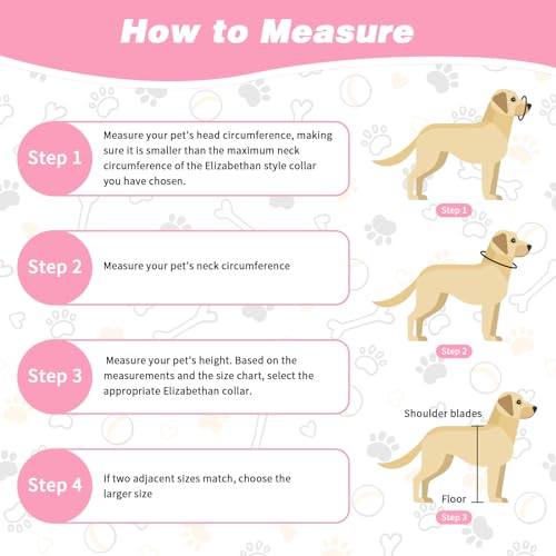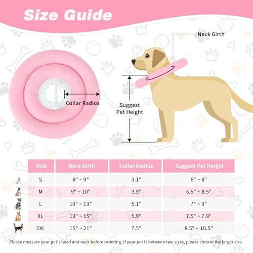 【5 Sizes Available】The elizabethan collar for dogs has 5 sizes to choose. S/M/L has 2 circle rings, XL/2XL has 9 circle rings. which fits most large, medium and small dogs. So please measure your pet’s head and neck before ordering. If your pet is between two sizes, please choose the larger size.