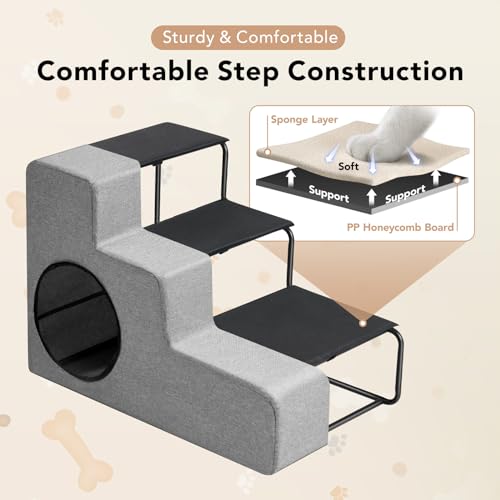 - Comfortable Step Construction: The steps are crafted with a combination of a layer of sponge and PP honeycomb board, providing a perfect balance of firm support and gentle cushioning, to ensure maximum paw comfort. Rubber dots on the bottom provide extra grip, which can be firmly attached to the ground to ensure the stability of the dog steps.