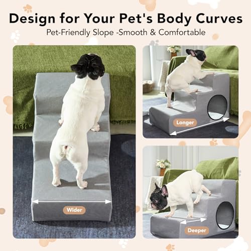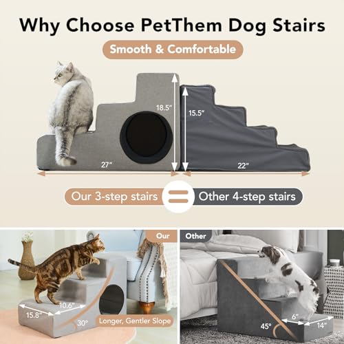 - PetThem 2024 Upgrade Pet Stairs: PetThem dog stairs for bed stand out from traditional foam dog ramps with exceptional features -Premium Metal Frame for durability and stability -Sponge & PP Honeycomb Board Steps for paw comfort support -Extended Dimensions provide a joints-friendly gentle slope