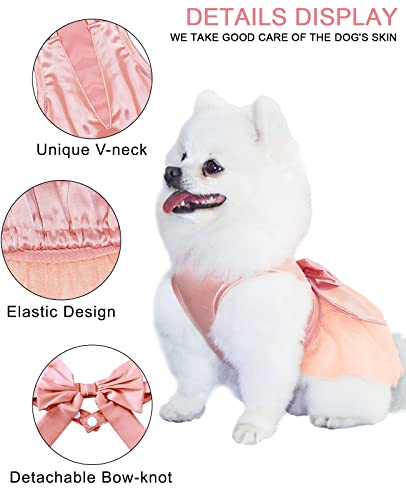【Unique Design】The dog sundress with a detachable bow-knot, this design allows the dress to be worn in two ways, making your pet look elegant and glamorous. Elastic design makes it easy to put on and take off, and a high belly cut to make it easier for the puppies for potty breaks, it can give your pets a comfortable wearing experience.
