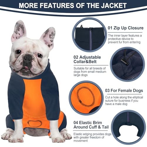 【Multi-Functional Dog Sweater Coat】Our polar fleece dog coat dog onesie for cold weather is most suit for female dogs. For male dogs, a circle part on the belly bottom of the dog winter jacket, which can be cut for convenient pee or poo. The turtleneck dog snowsuit is great for indoor or outdoor activities, such as daily walking, running, jogging, hiking, training.