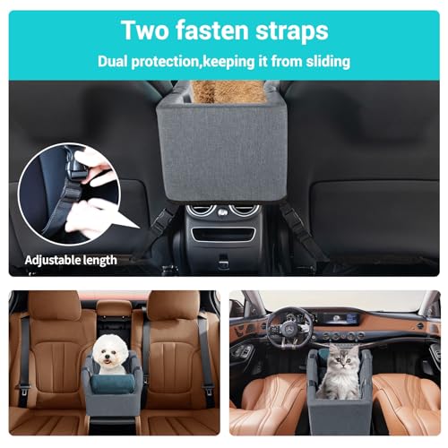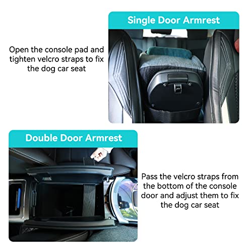 STAYED FIRMLY IN PLACE – There is double Velcro straps to prevent it sliding forward and backwards, and this upgraded dog console car seat had tie downs that anchored the seat to the driver and passenger seat frame base(s) on each side, so as to prevent it slides to side. And the longer strap is adjustable to fit most of vehicles.