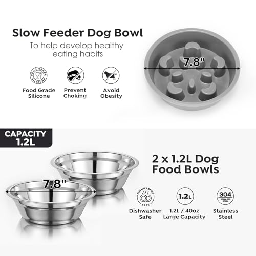 Comes with A Slow Feeder Dog Bowl and 2 Stainless Steel Food Bowls. Includes a dog slow feeder bowl crafted from 100% food-grade silicone, ensuring optimal digestion and preventing overeating. Along with 2 stainless steel dog food bowls with 1.5L capacity, guaranteeing ample space for your furry friend’s nourishment.