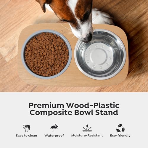 Durable & Easy-to-Clean Dog Feeding Station. With a sturdy metal frame and premium wood-plastic composite construction, the dog bowl stand blends durability and aesthetics seamlessly. It’s also waterproof and moisture-resistant, allowing for easy cleaning and maintenance.