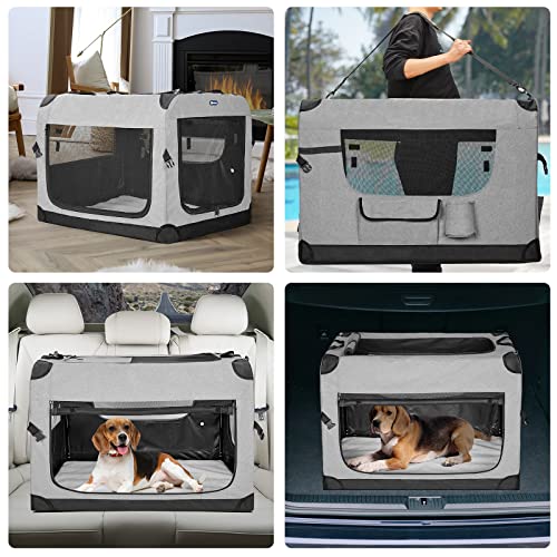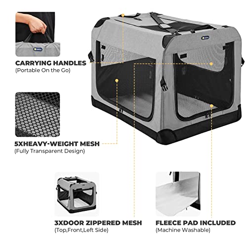 Folding soft-sided 20″*13″*13″ dog crate for small dogs up to 15 lbs. Crafted of 600D Cationic Oxford fabric and tight weave mesh, it boasts reliable sturdiness.