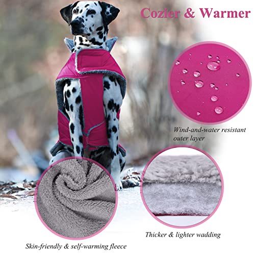 【Warmer & Cozier】: This dog winter coat is constructed with 3-Layers. Outer layer is ripstop & water resistant & windproof oxford fabric; Padded layer is thicker polyester & wadding filling; Inner layer is super soft skin-friendly & self-warming fleece; Keeps your pup cozy and dry and provide maximum warmth feeling when heading out on walk even chilly days. Warm belly coverage and stand-up neck with furry fleece lined let your pets feeling soft and comfortable, cozy, and fluffy