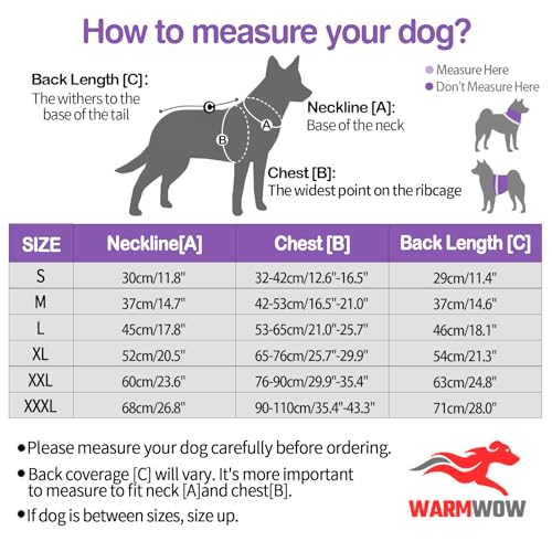 Water Resistant and Reflective: This dog cold weather coats have a water resistant yet breathable coating perfect for those snowy, drizzle, and wet days( Not for heavy rain or downpour). The fleece Dog jacket with water resistant outer fabric keeps your dog dry on those cold and wet days. And Reflective straps are added so your dog can be seen in the dark, making your dog visible during walking at dawn, dusk, and night. Go enjoy with WarmWow dog snow jacket this winter.
