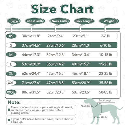 【Sizes】: We have 5 sizes to choose from, and suitable for small and medium dogs, such as chihuahua, french bulldog, pug, golden retriever, schnauzer, poodle, corgi, basset hound. Different dog breeds have unique body proportions, so it’s important to measure your dog’s chest and back length accurately before purchasing warm clothes.