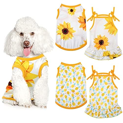 $15.994 Pieces Pet Clothes Set Include 2 Pieces Cute Pet Dress Lovely Fruit Dog Dress and 2 Pieces Dog Shirt Breathable Pet T-Shirt Puppy Clothes Shirt for Pet (Pineapple, Sunflower,Large)