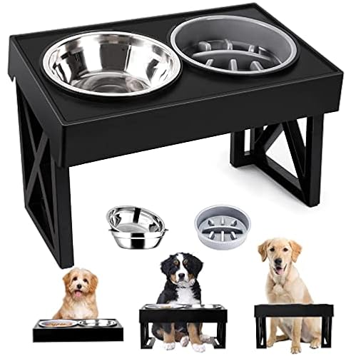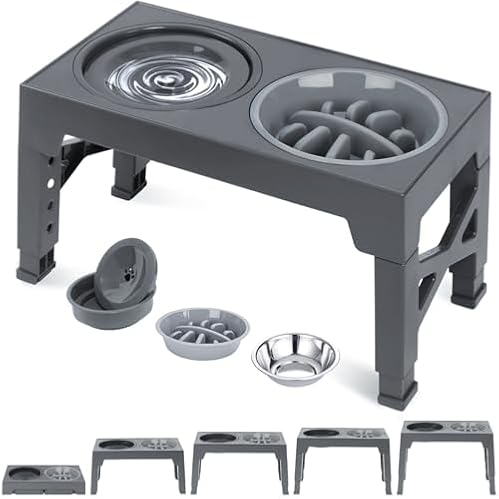 $23.99Elevated Dog Bowls of 5 Height Adjustable, HenFit Slow Feeder Dog Bowls with No Spill Dog Water Bowl, Non-Slip Food and Water Bowls with Stand for Large Medium Small Dogs, Cats and Pets (Grey)
