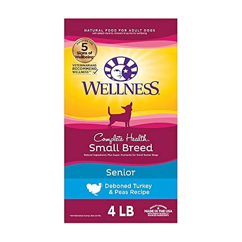 - Wellness Complete Health Small Breed Dry Dog Food with Grains, Natural Ingredients, Made in USA with Real Turkey, For Dogs Up to 25 lbs. (Senior, Turkey & Peas, 4-Pound Bag)$18.10