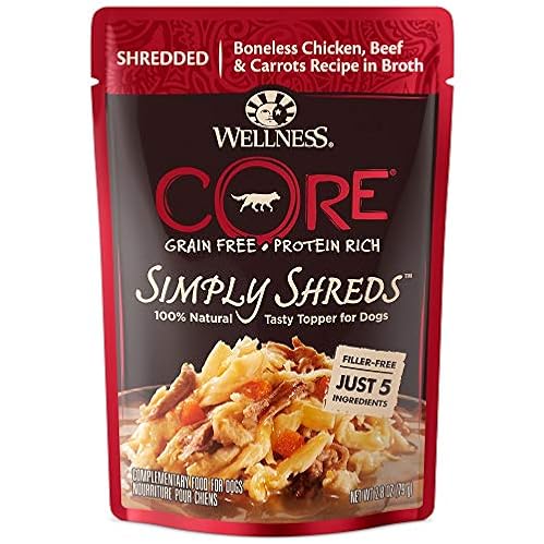 - Wellness Bowl Boosters Simply Shreds Natural Grain Free Wet Dog Food Mixer or Topper, Chicken, Beef & Carrots, 2.8-Ounce Pouch(Pack of 12)$22.80