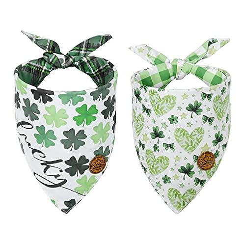 $13.99CROWNED BEAUTY St Patricks Day Dog Bandanas Large 2 Pack, 4 Leaf Clovers Set, Plaid Shamrocks Hearts Tartan Adjustable Triangle Holiday Reversible Green Scarves for Medium Large Extra Large Dogs Pets